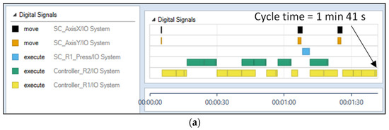 Figure 11 reports an example of tests performed to identify the optimal sequence permutation of the same list of operations. In the figure, three different sequences are reported, respectively, assigned to the positioning table axes, the press, and the two robots. The colored bars show the activation times of the devices, as highlighted by the legends in the figures. It is evident how some operations can be parallelized, while in other moments, the operability of a device must be suspended until specific actions are completed. However, looking at the three different operation sequences it emerges that different levels of operations can simultaneously be reached. For instance, in the reported case, (a) the operations performed by Robot 1 (yellow band), which is the device with a major workload in the cell, are fragmented, and the overall cycle time is degraded due to frequent downtime periods.
