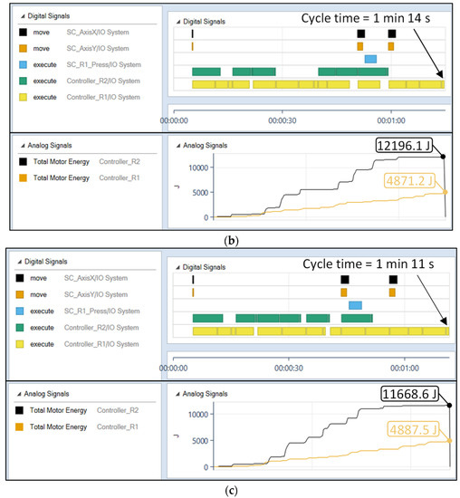 The improved sequences of operations leads to an overall cycle time reduction of 30%, i.e., from the initial 101 s to an intermediate sub-optimal solution (i.e., 74 s, case (b)) and finally, to a saving of more seconds (i.e., 71 s, case (c)). As a further demonstration of the VC tool potentialities, the same picture reports the RS estimation of the total energy required by the motors of the robots during the entire work cycle, comparing the sub-optimal and the optimal sequences. It can be observed that the last case provides an overall reduction in energy consumption of 3% (i.e., from 17,067 J to 16,556 J). It is worth noting that, based on the declared design intents, any other output made available by RS simulation can be utilized as a performance index in the optimization study.