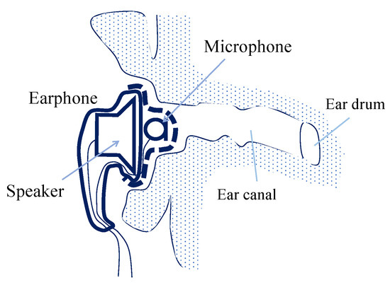 In ear acoustic authentication, biometric authentication is performed using a special earphone with a small embedded microphone, as shown in Figure 1. In this study, ear canal transfer characteristics are defined as the characteristics related to signal transmission between the earphone and microphone placed at the entrance of the ear canal. The ear canal transmission characteristics include the acoustic characteristics of the ear canal, electroacoustic conversion characteristics of the earphone, acoustoelectric conversion characteristics of the microphone, and characteristics depending on the positional relationships between the microphone and earphone. The ear canal transfer characteristics become the ear canal impulse response (ECIR) in the time domain and are represented by the ear canal transfer function (ECTF) in the complex frequency domain. An ECIR can be derived by measuring the acoustic characteristics using an impulse response measurement method with a time-stretched pulse signal or a maximum length sequence (MLS) signal. The acoustic characteristics differ for each user because they depend on the unique physical characteristics of the individual [18]. In ear acoustic authentication, focus is placed on the individuality of the ear canal transfer characteristics, and biometric authentication is performed by applying feature extraction processing to the discriminator.
