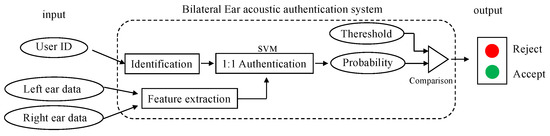 In this study, we adopt the ear acoustic authentication system illustrated in Figure 5. This system employs 1:1 authentication, a type of authentication that initially identifies the user and subsequently ascertains whether the measured biometric information belongs to that user. We used support vector machine (SVM), a type of supervised learning used for classification, regression, and outlier detection, as the discriminator of authentication. It can also calculate posterior probabilities as suggested by Platt et al. [19] and Wu et al. [20]. If the posterior probability is high, the probability of identifying the user is high. Ultimately, the system compares the posterior probability to a threshold and outputs “Accept” or “Reject”.