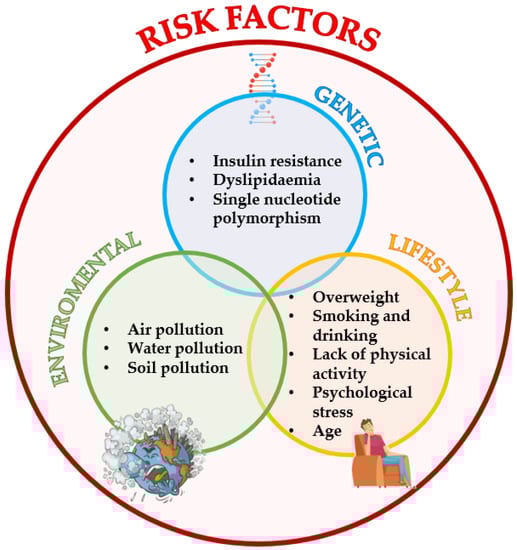 Numerous studies have found significant gene–environment interactions in the etiology of obesity as well in the pathogenesis of type 2 diabetes and coronary heart disease []. Individual genetic predispositions and environmental circumstances work together to support or hinder cellular processes. Complications emerge as a result of accumulated genetic and environmental risk factors, impacting health and reducing lifespan []. The single-nucleotide polymorphism (SNP) rs662799 in the APOA5 (apolipoprotein A5) gene is associated with an increased risk of MetS and its components []. Moreover, data have revealed that the adiponectin rs266729 gene polymorphism is reduced in colorectal cancer patients, implying that lower levels may be a significant risk factor for colorectal cancer in MetS patients [].