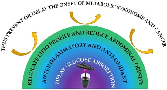 Nowadays, we know more and more about the genesis and causes of many chronic diseases. Certain interconnected factors could predispose to type 2 diabetes and cardiovascular disease and currently are defined as metabolic syndrome (MetS). The main considered factors are dyslipidemia (high levels of low-density lipoprotein (LDL), triglycerides (TG), and low levels of high-density lipoprotein (HDL)), high blood pressure, obesity, impaired glucose metabolism, and/or insulin resistance [,]. Although it is diagnosed based on at least any three metabolic changes, the most common features of the pathophysiology of MetS are insulin resistance and visceral adiposity []. The pathogenic processes of MetS are complex and still debated. The geographic diversity in MetS distribution highlights the importance of environmental and lifestyle factors as major causes. Most of the mechanisms are triggered by visceral adiposity. However, major contributors to the onset, progression, and transition of MetS to cardiovascular diseases (CVD) are neurohormonal activation, insulin resistance, and inflammation []. It is considered that MetS could considerably increase personal healthcare costs and be an important risk factor for mortality in most developed countries [].