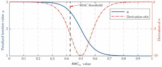 The correction pairing results of the best individual in the last-generation population are listed in Table 11. Compared with the best individual in the initial population (see Figure 10d,g), the number of correlation pairing modes was increased from six to nine after updating, which improved the exploitation of experimental modal data. The MAC values of the corresponding modes were increased. The was decreased to 0.2591. Besides, the FRE values of the other modes were all within 10% except the eighth mode. The was reduced to 6.50%.