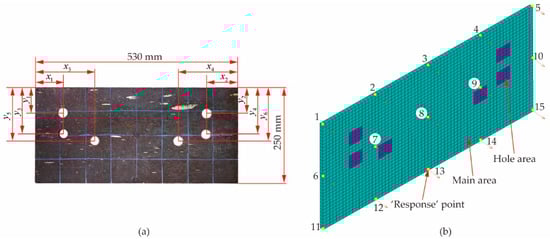 A thin plate with non-uniform thickness and small holes is investigated to test the proposed CMPES method, as shown in Figure 3a. The average thickness, length, and width are 8, 530, and 250 mm. The diameter of all the holes is 24 mm, and the location of these holes can be determined as follows: , , , , , , .