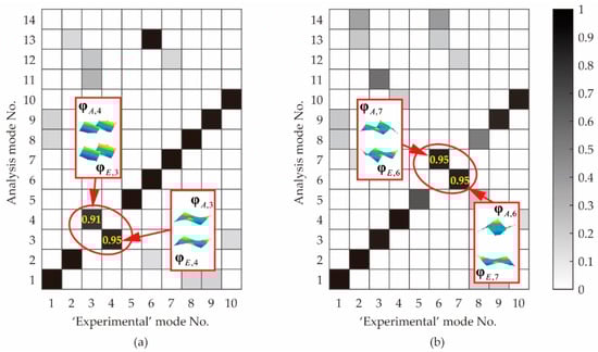 Figure 9 shows the correlation analysis results of the initial analytical and experimental modes. It can be seen that the maximal MAC value was 0.75, which was much smaller than that in Table 6. When performing correlation pairing with a larger MAC threshold, such as 0.5, the case 0↔n occurs frequently. If a smaller MAC threshold of 0.25 is used, though the number of pairing modes increases, the case 1↔n increases sharply. Therefore, the correlation pairing results change significantly due to different MAC thresholds.