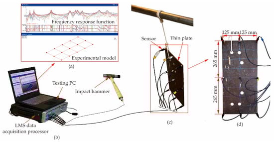 Overview of the impact modal test of the thin plate. (a) Screenshot of the frequency response function and experimental model. (b) Impact modal test instrument. (c) Suspension of the thin plate. (d) Location of the sensors.