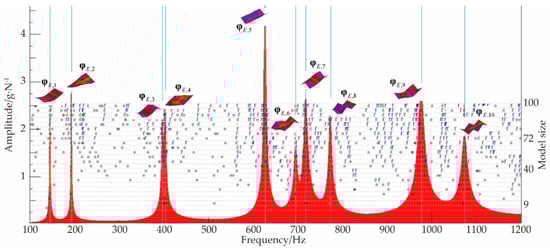 The analytical bandwidth ranged from 100 to 1200 Hz. The stability tolerances of vibration vector, frequency, and damping were 2%, 1%, and 5%, respectively, and the model size was 100. Then, a clear stabilization diagram was obtained based on the poly-reference least squares complex exponential method [37], as shown in Figure 6. The first ten modes are marked by the red letter “s” and violaceous line in Figure 6.