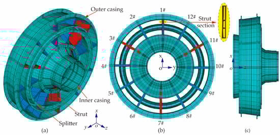 This section describes the updating of an intermediate case (IMC) of a gas turbine to validate the potential of the proposed CMPES method for complex engineering structures. IMC is a vitally important transition channel between a low-pressure compressor and a high-pressure compressor, and it is the main load-bearing component because the thrust generated by the engine is transmitted through it. The IMC is welded by titanium alloy consisting of the outer casing, strut, splitter, and inner casing. The cross-sectional shapes of the twelve hollow struts (abbreviated as 1#–12#) are not the same due to the different functions. Holes with different apertures, cross-sectional shapes, and locations are processed on the multi-layer thin-walled cases. In addition, many installation accessories are assembled on it, including mount, rectifier rotating rocker arms, and lubricating oil ducts. Therefore, it is a great challenge to establish an accurate FE model.