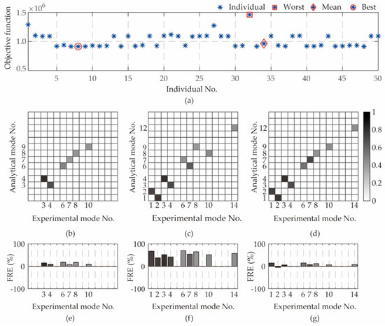 The objective function values of all individuals in the initial population were calculated by Equation (18), shown in Figure 10a. Three typical individuals in the initial population were marked: the worst individual (individual no. 32, box), the individual closest to the mean (individual no. 34, diamond), and the best individual (individual no. 8, circle). The MAC matrices and corresponding FRE bar graphs of these three individuals determined by the correlated mode auto-pairing strategy are shown in Figure 10b–g. The numbers of correlation pairing modes and the swapped mode orders differed. The corresponding FRE values changed significantly among individuals. It is not possible to capture these differences by using a constant correlation pairing method based on pre-analysis.