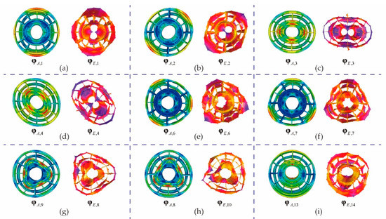 Unlike the simulated “experimental” data, the modes obtained in the impact modal test were complex. Since all the modal damping ratios in Table 6 were less than 0.7%, the realization method was used by multiplying the modulus of each element of the complex mode shape vector by the sign of the cosine of its phase angle [10]. As shown in Figure 6, the first ten real mode shapes were obtained. Then, the following updating process was the same as Section 4.1.1.