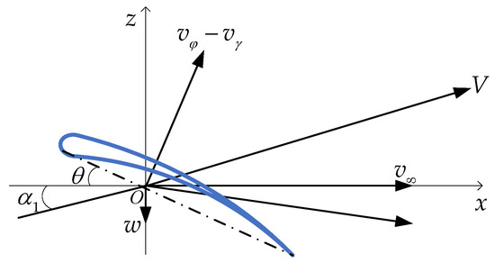 where is the zero-lift angle of the wing (assumed to be 0° here); is the aspect ratio of a wing; and is the static pitch angle, which is equal to the sum of the wing mounting angle and the twist angle . Therefore, the relative velocity of the airflow after synthesis at the aerodynamic center of the strip can be further calculated: