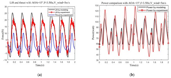 It should be noted that due to the presence of noise, the experimental data were processed with low-pass filtering with a cutoff frequency of 50 Hz. Lift and thrust are very important for the flight of a flapping-wing vehicle. A graph of the lift (vertical direction) and thrust (horizontal direction) measured by experiment in the proposed model is in Figure 8a. As shown in Figure 8a, the lift results measured by model and experiment of wing #1 at angle of attack of 15°, flapping frequency of 3.5 Hz, and wind speed of 5 m/s are compared. The trend of lift with time calculated by the model is basically the same as the experimental results, but the peak value of the model is slightly larger than the experimental results. The power comparison between the model and the experiment for wing #1 is illustrated in Figure 8b. Because aerodynamic power is cubically related to velocity, the model data can be seen clearly in two peaks in one flapping cycle, which is also corroborated in the experimental data.