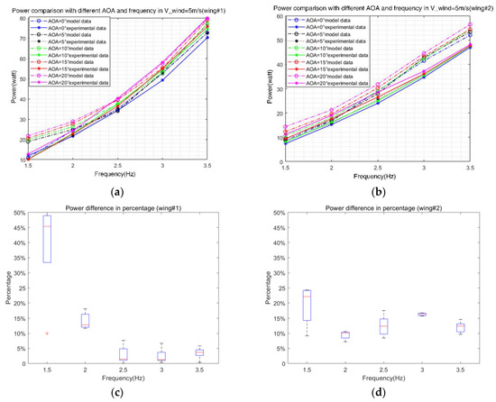 (a) Power comparison of wing #1 with different AOA and frequency in V_wing = 5 m/s; (b) power comparison of wing #2 with different AOA and frequency in V_wing = 5 m/s; (c) power difference in percentage between the experimental and model result of wing #1; (d) power difference in percentage between the experimental and model result of wing #2.