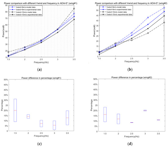 (a) Power comparison of wing #1 with different velocity of wind and frequency in AOA = 5 m/s; (b) power comparison of wing #2 with different velocity of wind and frequency in AOA = 5 m/s; (c) power difference in percentage between the experimental and model result of wing #1; (d) power difference in percentage between the experimental and model result of wing #2.