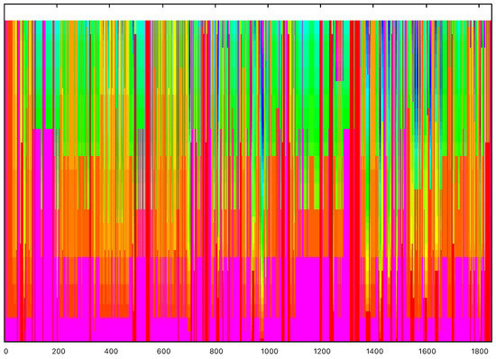 Family tree of 1800 recordings presented as heat map. Columns of equal colour represent clusters.