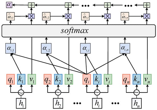 where denotes the output of the BiGRU layer, l is the hidden layer dimension of the GRU unit. is the trainable weight and d is the output dimension. In this paper, we take as an example to further explore the execution process of the self-attentive mechanism, as shown in Figure 2.