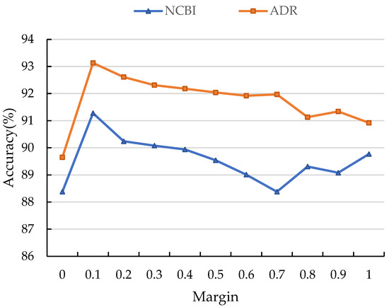 In addition, in order to study the effect of margin value on the model effect in the triplet loss function, different margin values were set for comparison experiments, and the experimental results are shown in Figure 4. For the NCBI dataset and ADR dataset, the model achieved the best results when the margin value was 0.1. When the margin value was set too low, the loss tended to be close to zero, and it was difficult to distinguish similar entities. When the margin value was set to 0, the accuracy was only 88.38% and 89.65% on both datasets. When the margin value is set too large, the loss value keeps a large value, making it difficult to converge. Therefore, it is critical to set a reasonable margin value, which is an important indicator of similarity.