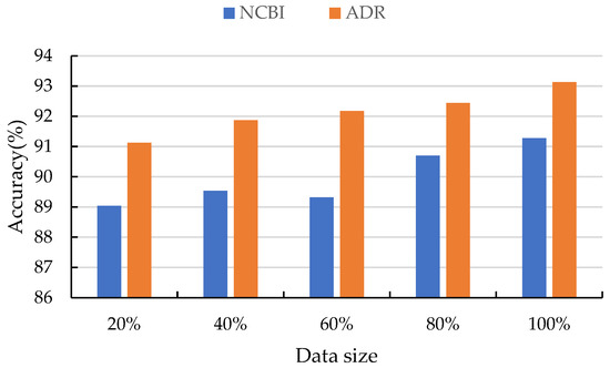 By subsampling the dataset, we also investigate the performance of the model on training samples of different sizes, as shown in Figure 5. The performance of the model in this paper grows when the number of training samples is gradually increased. When only 20% of the training samples were used, the accuracy on the NCBI and ADR datasets also reached 89.04% and 91.13%, respectively. More data will bring better performance, and the biomedical entity linking model in this paper can achieve better results despite using a small amount of labeled data.