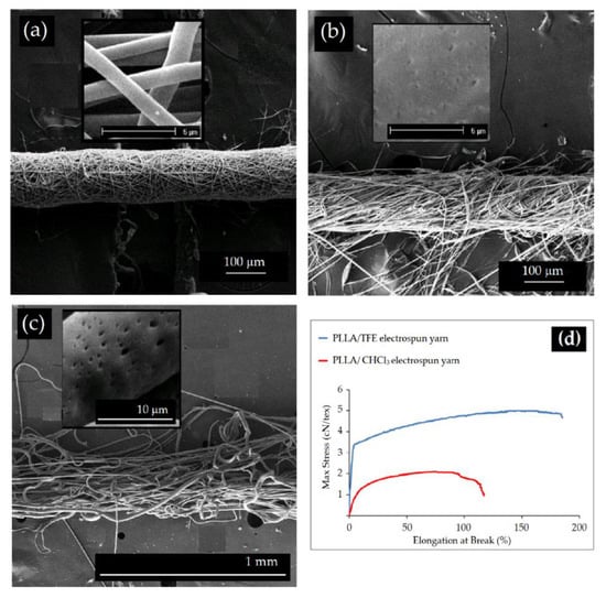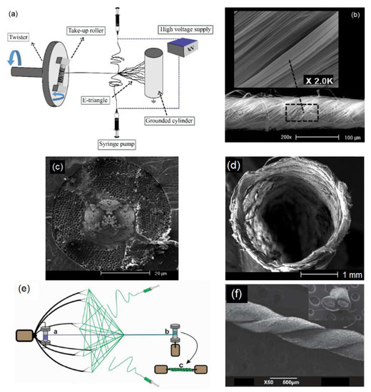 - Maleki, H.; Gharehaghaji, A.A.; Dijkstra, P.J. Electrospinning of continuous poly(L-lactide) yarns: Effect of twist on the morphology, thermal properties and mechanical behavior. J. Mech. Behav. Biomed. Mater. 2017, 71, 231–237. [Google Scholar] [CrossRef] [PubMed]