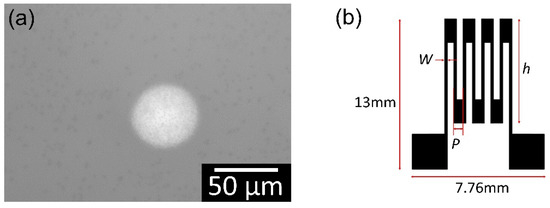 (a) Deposited single droplet on the substrate. The droplet diameter was approximately 51.4 μm. (b) The designed strain-gauge pattern. W, P and h are the width, pitch and height of the pattern, respectively.