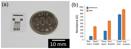 Figure 3a illustrates the printed strain-gauge pattern on the PET substrate. The pattern was 7.76 mm in width and 13 mm in length. Seven samples were prepared for each topographical condition. The initial resistances of the printed strain-gauge patterns after sintering are depicted in Figure 3b. The resistance steadily decreased as the number of stacked layers or the width increased. The mean and standard deviation (SD) values of the resistance for each topographical condition are summarized in Table 1. The maximum percentage coefficient of variability, calculated as SD/mean × 100 (%CV), was 3.8% for the seven-droplet pattern. The minimum %CV was 1.6% for the two-droplet pattern. All %CV values were less than 5%, demonstrating the excellent reliability of the experimental dataset. In addition, normality was verified in the Anderson–Darling test for all datasets, as presented in Table 1 (p > 0.05).