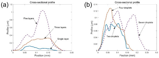 Figure 4 shows the cross-sectional profiles of the printed strain-gauge patterns. Figure 4a indicates that the thickness of the printed pattern was proportional to the number of stacked layers, and that the evenness of the pattern deteriorated for the five-layer pattern. It is assumed that the amount of evaporation was greater in the edge area of the deposited ink than in the central area, and that the resulting unbalanced evaporation forced the solute to move to the side area, producing a so-called coffee-ring effect [20,21]. The thickness of the coffee-ring stain superposed in the following printed layers. The peaks for single-, three- and five-layer patterns were 0.11934 μm, 0.32591 μm and 1.0 μm, respectively.