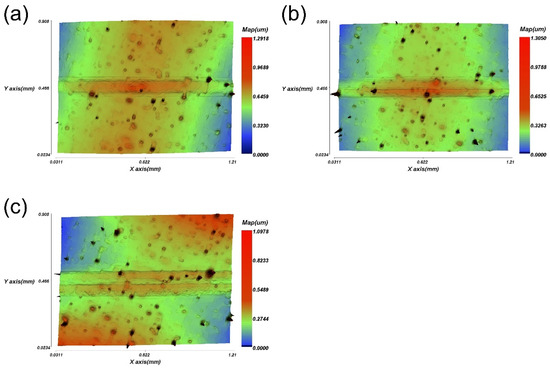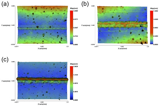 Interferometer images of printed strain gauges with stacked layers: (a) single layer, (b) three layers and (c) five layers.