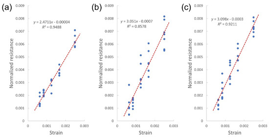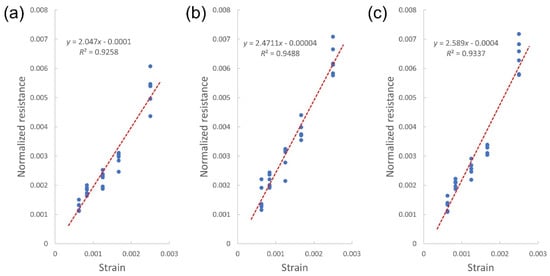 Gauge factor as a function of the number of stacked layers of printed strain-gauge patterns: (a) 2.471 for a single layer, (b) 3.051 for three layers and (c) 3.098 for five layers.