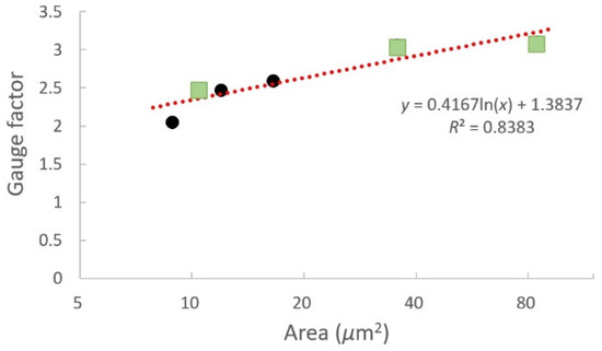 The cross-sectional areas of the printed strain gauges and corresponding sensitivity factors are summarized in Table 2. Figure 9 shows that the gauge factor was proportional to the cross-sectional area of the printed strain-gauge pattern. The correlation was mathematically modelled as y = 0.4167ln(x) + 1.3837, where x is the area in microns squared and y is the gauge factor. The coefficient of determination (R2) was 0.8383.