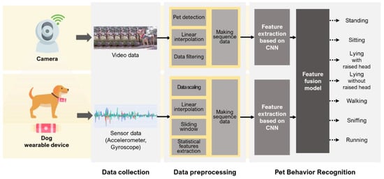 Table 1 summarizes previous studies of dog behavior recognition using video data or sensor data. To date, there have been many machine learning-based behavior recognition studies, but research has been conducted by collecting either only video or sensor data. There are studies on behavior recognition based on multimodal data that embed various sensors in wearable devices, but fusing it with other types of data can improve the accuracy, and if data noise occurs, it can be compensated. Accordingly, in this paper, we aimed to improve the behavior recognition accuracy of dogs by solving the problems of existing studies through deep learning-based fusion of sensor data and video data.