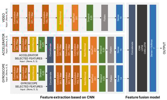 Feature extraction for sensor data were performed by dividing the accelerator and gyroscope. First, the raw data and the selected features are concatenated. Next, the convolution operation is performed twice with size (3, 1) and once with size (1, 3). The first two are for dimensionality reduction for features, and the last is dimensionality reduction for three axes. Then, after batch normalization, maxpooling of size (2, 1) is performed, and dropout is performed at a rate of 0.25. Finally, through flattening of the extracted features, the dense layer and batch normalization are performed. For the gyroscope data, the same process was performed. Finally, the extracted features of the accelerator and gyroscope are concatenated again.