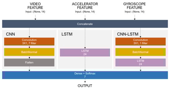 Behavior recognition based on multimodal data that fuses these different types of data requires deep learning techniques that can automatically extract abstract features for each data type. Accordingly, multilayer perceptron (MLP), convolutional neural networks (CNNs), and recurrent neural networks (RNNs) are widely used to study behavior recognition and show higher performance than existing methods [7,14,15,16].