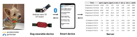 To make the collection environment as similar as possible to the environment in daily life, there were no restrictions on the space inside the house, such as the living room or outdoor space, and a camera was installed so that the front or side of the dog could be seen. In addition, to increase the detection rate of the dog in the video, videos were not taken from too far away. The IP camera used was the HejHome Smart Home Camera pro, and the resolution was Full HD (1920 × 1080) and 20 FPS. Figure 4 describes the process of collecting sensor data from a manufactured wearable device based on the Arduino nano 33 IoT board. The wearable device was manufactured as a collar. Data were collected from the server through Bluetooth with an Android-based smart device. The accelerometer and gyroscope data were collected using the LSM6DS3 module.