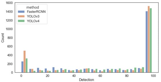 For the video data, FasterRCNN, YOLOv3, and YOLOv4 were used to check the dog detection rate. To confirm the detection rate, an experiment was conducted using a pre-trained model with the COCO dataset in three dog detection methods. Figure 5 displays one of the detected results for “sitting”. YOLOv4 detected the dog’s size better than the other methods. Figure 6 shows the detection distribution according to the amount of data. YOLOv3 had the largest amount of data with a 100% detection rate and the largest amount of data with a 0% detection rate. On average, FasterRCNN’s detection rate was 68.62%, YOLOv3′s was 67.13%, and YOLOv4 had the highest detection rate at 72.01%. Figure 7 shows the detection distribution by behavior. Overall, the recognition rate was high when the dog performed B2 behavior, and the detection rate was the lowest when the dog performed B7 behavior.