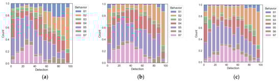 Distribution of detection by dog behavior per method: (a) FasterRCNN; (b) YOLOv3; (c) YOLOv4.