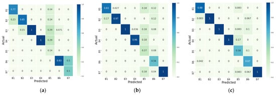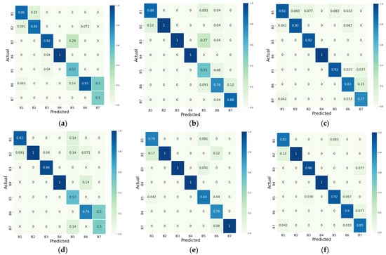 Figure 10 shows the confusion matrix for each fusion model. The recognition rate for all behaviors is improved overall compared to the case of using single data. However, among them, the behavior recognition rate for B5 and B7 is slightly low. FasterRCNN, which showed a very lower recognition rate for B5 and B7 when using only video data, improved when using multimodal data, but still shows low numbers as shown in Figure 10a. Even with the CNN-LSTM model, FasterRCNN had a low behavior recognition rate for B5 and B7 as shown in Figure 10d, whereas YOLOv3 and YOLOv4 significantly improved the behavior recognition rate with the CNN-LSTM model as shown in Figure 10e,f.