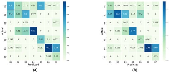 Figure 9 shows the confusion matrix for None with no features selected and for the best feature combination in Table 6. The sensor data showed that behavior recognition for B4 and B6 was well achieved, and it was confirmed that the recognition rate for B2 was improved when statistical features were included. Since the device worn around the neck was sensitive to the movement of the head, it is judged that the recognition rate was high because these behaviors feature fewer head movements than other behaviors.