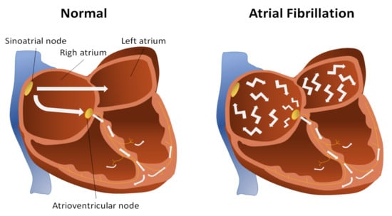 Atrial fibrillation (AF) is one of the most common types of arrhythmia [,]. In this pathology, the electric signals that come from the atria (two small chambers of the heart) are sent in a very fast and uncontrolled way, which produces vibration in the atria instead of contraction, and the electric signals reach to the ventricles irregularly (Figure 1) []. When the contract of the auricles is not effective, blood can accumulate or clot. If one of these clots is placed in a cerebral artery, it can lead to stroke [].