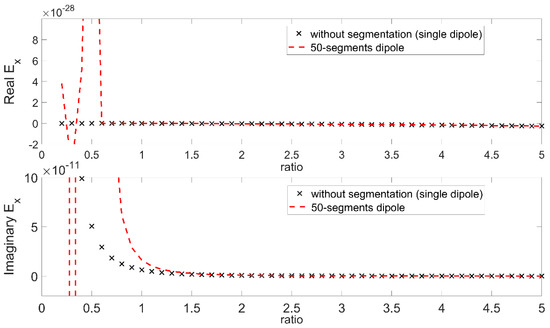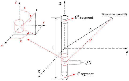 - Segmented Cable Case with Near Field Approximation: is when the electric field is evaluated from the superposition of the electric fields of N segment dipoles, each having a length equal to L/N, laying consecutively on the cable path with its center at −L/2 + L/2N + i*L/N (i = 0, …, N − 1), and contributing to the total field with its segment field calculated from (4)–(6).
