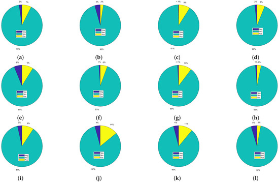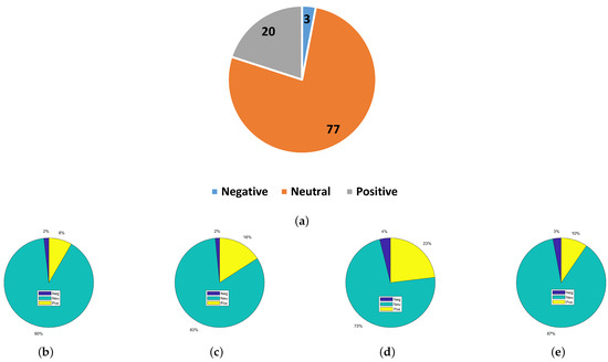 In addition to the sentiment classification, the information provided in dataset-1 can be used to analyze the quality of an article by analyzing the number of citations and the ratio of positive, negative, and neutral sentiments regarding that article. For this purpose, the articles with at least 100 citations are selected from dataset-1, and the distribution of the citations is given in Figure 2. Each sub-figure is drawn for one article, and only articles that are cited by 100 or more papers are included. The Figures show the distribution of the citation sentiments of a specific scientific article within other articles, which means the positive, negative, or neutral context in whichever paper is cited. For example, if the paper is praised for its contribution, the sentiment is positive; if it is criticized, the citation sentiment is negative, and so on. This indicates that neutral citations are predominant for research articles, followed by positive citations, while negative citations are the lowest on average. Currently, authors’ ranking is determined solely by the number of citations their works have recieved, which is not correct, as the majority of the citations do not attest to the scientific significance of the articles. Instead, a higher number of citations is neutral. Considering the positive sentiments would be much more appropriate for analyzing the true potential of an article. Similarly, several articles have a higher number of negative citations, say, for example, Figure 2b,f, where the number of positive and negative citations are almost equal; however, both types of citations are considered as positive when determining the importance of those articles. Similarly, Figure 2l shows a higher number of negative citations, yet, negative citations are counted analogously to those that are positive and neutral.