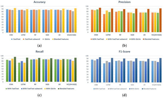 Figure 4a shows the accuracy comparison of models using fastText, fastText subword, and GloVe. It can be observed that CNN achieved the best results with every word embedding technique, as compared to the other models. On the other hand, LSTM has shown the highest accuracy result with combined features and the lowest accuracy with GloVe. Machine learning models and the voting classifier has also shown moderate performance results when trained on fastText. RF, LR, and SGD showed improved results when trained on fastText subword, and the lowest results when trained on GloVe.