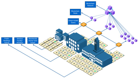 Our framework makes use of three main innovations to implement unique properties, which we rely upon to address the limitations of existing indoor location systems. The architecture encompasses these as modules such that it allows interoperability between them to achieve an additive effect of their unique properties. In our implementation, we design a unique cost-effective passive indoor location system that relies on off-the-shelf sensors embedded in an additional layer between the tiling described in more detail in Section 3.2. At the local level, the sensors form a WSN which reduces the complexity of the large-scale implementations. The security and network anonymity [45] concerns are addressed by a specially designed computational model that relies on onion-routing [46] messages for network anonymity, and a general-purpose obfuscated computing model. By using multi-layer encryption and onion routing, nodes are able to collaborate in federated and distributed computations without ever revealing what the global computation is, nor the origin of the computation; further details can be found in Section 4. In the third module, we further improve the security and reliability of the solution by decentralizing the system to introduce much-needed fault tolerance, and secure the entire solution against a single point of failure (SPOF). By using blockchain, we are able to replace sink nodes with smart contracts. We implement an access control module that protects the underlying WSN against unauthorized queries, further detailed in Section 5.
