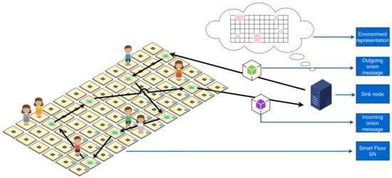 Tošić et al. [28] present a non-intrusive fall detection solution based on a smart floor, which this paper extends to an indoor location system. The system enables a non-intrusive (with no need for special applications based on wearable devices, smartphones or any other devices) indoor location system with additional privacy preserving properties such as anonymity and sensor location/network anonymity. We achieved this by using the smart floor, coupled with onion routing for source location anonymity and blockchain for the final sink personal pseudo-anonymity.