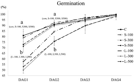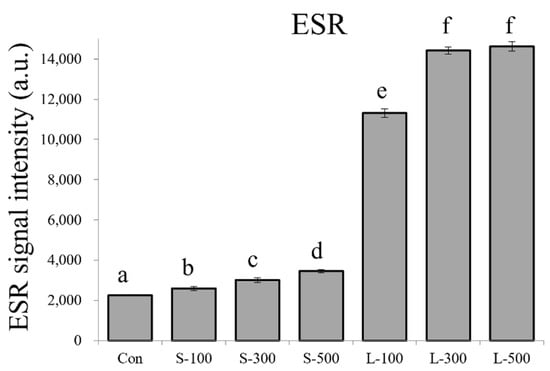 Measurements of the free radical content in wheat seeds following short- and long-term gamma irradiation using electron spin resonance (ESR). Con, non-irradiated seeds (0 Gy); S, short-term irradiation; L, long-term irradiation; 100, 300, and 500, gamma irradiation doses. Each bar represents the mean ± standard deviation (SD). Values with different letters are significantly different using Duncan’s multiple range test (p < 0.05).