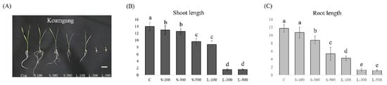 Gamma irradiation effect on plant growth under different doses and exposure times. (A) Image of plant growth under different irradiation conditions. Scale bar: 2 cm. (B) Shoot and (C) root length 10 days after germination. Each bar represents the mean ± SD (n = 10). Values with different letters are significantly different using Duncan’s multiple range test (p < 0.05).