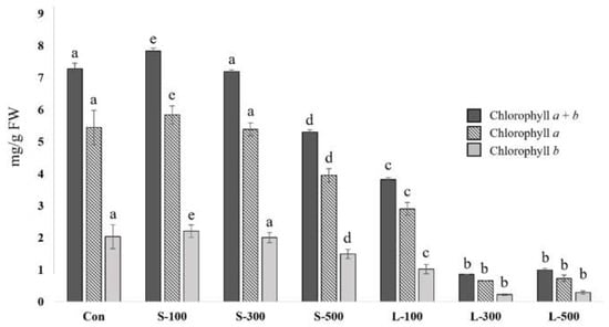 Determination of total chlorophyll, chlorophyll a, and chlorophyll b contents upon gamma irradiation. Each bar represents the mean ± SD (n = 3). Values with different letters are significantly different using Duncan’s multiple range test (p < 0.05).