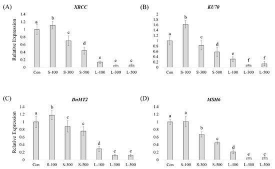 DNA-repair-related gene expression profiling in wheat seedlings determined by RT-qPCR. (A) XRCC, (B) KU70, (C) DnMT2, and (D) MSH6. RT-qPCR was performed with three biological replicates, and each bar represents the mean ± SD (n = 10). Values with different letters are significantly different using Duncan’s multiple range test (p < 0.05).