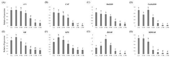 Antioxidant-related gene expression profiling in wheat seedlings determined by RT-qPCR. (A) APX, (B) CAT, (C) MnSOD, (D) CuZnSOD, (E) GR, (F) GPX, (G) DHAR, and (H) MDHAR. RT-qPCR was performed with three biological replicates, and each bar represents the mean ± SD (n = 10). Values with different letters are significantly different using Duncan’s multiple range test (p < 0.05).