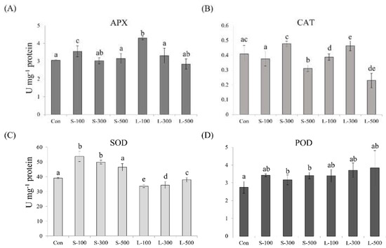 Short- and long-term gamma irradiation effects on (A) APX, (B) CAT, (C) SOD, and (D) POD antioxidant enzyme activities. Each bar represents the mean ± SD (n = 3). Values with different letters are significantly different using Duncan’s multiple range test (p < 0.05).