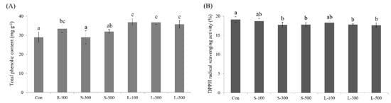 The total phenolic content was 28.91 mg/g in the control (non-irradiated seeds). The total phenolic content slightly increased to 33.38 and 31.88 mg/g in the case of short-term irradiation with doses of 100 and 500 Gy, respectively (Figure 8). In the case of long-term irradiation, a significant increase in the total phenolic content could be observed after long-term gamma irradiation. The total phenolic content increased by 27.37%, 26.94%, and 23.48% compared with the control at 100-, 300-, and 500-Gy radiation doses, respectively. The DPPH free radical scavenging capacity decreased slightly but non-significantly after gamma irradiation.